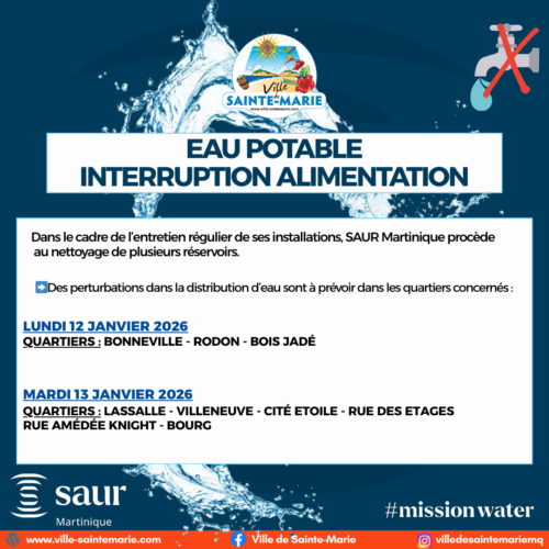 La Ville de Sainte-Marie informe la population que, dans le cadre de l’entretien régulier de ses installations, SAUR Martinique procédera au nettoyage de plusieurs réservoirs, entraînant des perturbations dans la