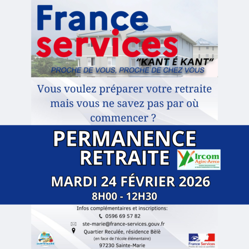 Jeudi 26 février 2026 De 10h00 à 12h00 France Services – Résidence Bèlè, Quartier Reculée, Sainte-Marie Permanence sur rendez-vous uniquement. Infos & prise de rendez-vous : 05 96 69 57