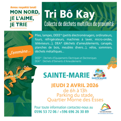Jeudi 2 avril 2026 De 6h à 13h Deux points de collecte près de chez vous : Parking du stade – Quartier Morne des Esses Parking de l’ancien lycée Lagrosillière