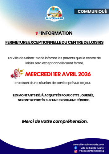 La Ville de Sainte-Marie informe les parents que le centre de loisirs sera exceptionnellement fermé : Mercredi 1er avril 2026 En raison d’une réunion de service prévue ce jour. Les