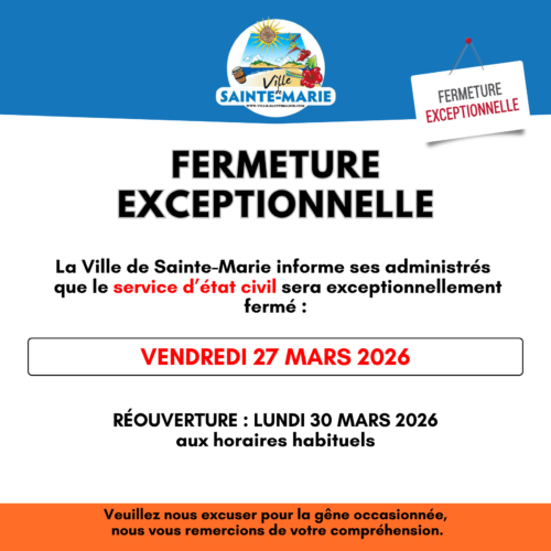 La Ville de Sainte-Marie informe ses administrés que le service d’état civil sera exceptionnellement fermé : Vendredi 27 mars 2026 Réouverture le lundi 30 mars 2026 aux horaires habituels. Nous