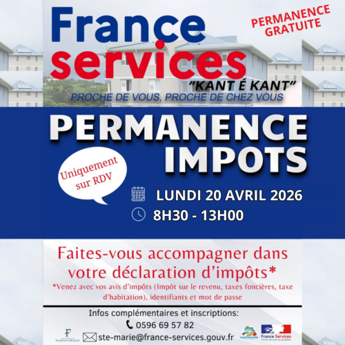 Vous avez besoin d’aide pour votre déclaration d’impôts ? Profitez d’un accompagnement personnalisé lors de cette permanence dédiée. Lundi 20 avril 2026 De 8h30 à 13h00 France Services – Sainte-Marie