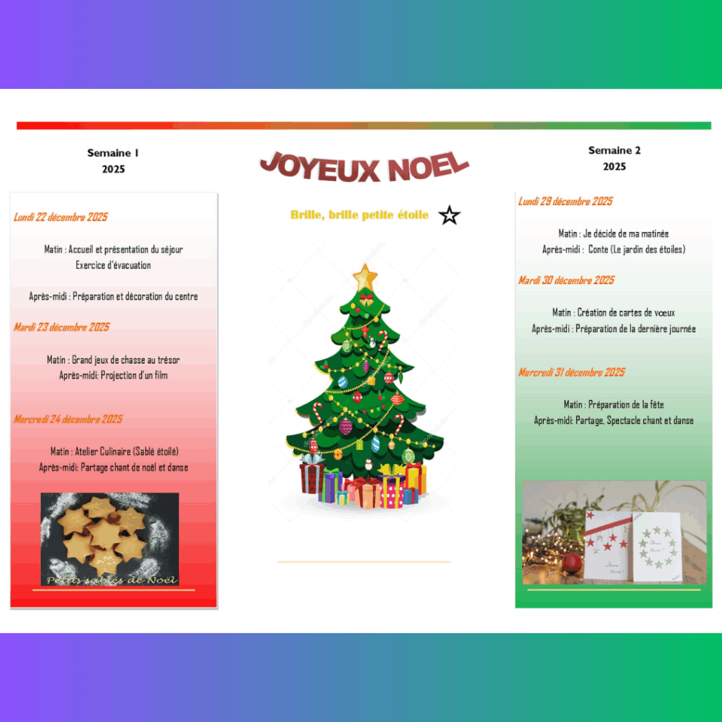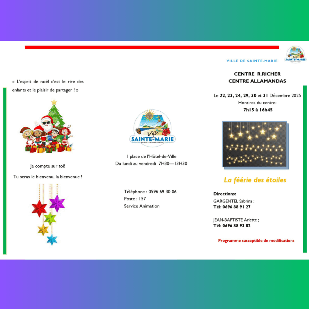 Le Service Animation de la Ville de Sainte-Marie informe les familles que les centres de loisirs de Noël se tiendront les :