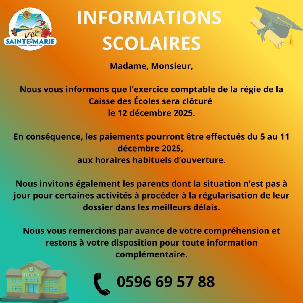 Nous vous informons que l’exercice comptable de la régie de la Caisse des Écoles sera clôturé le 12 décembre 2025.