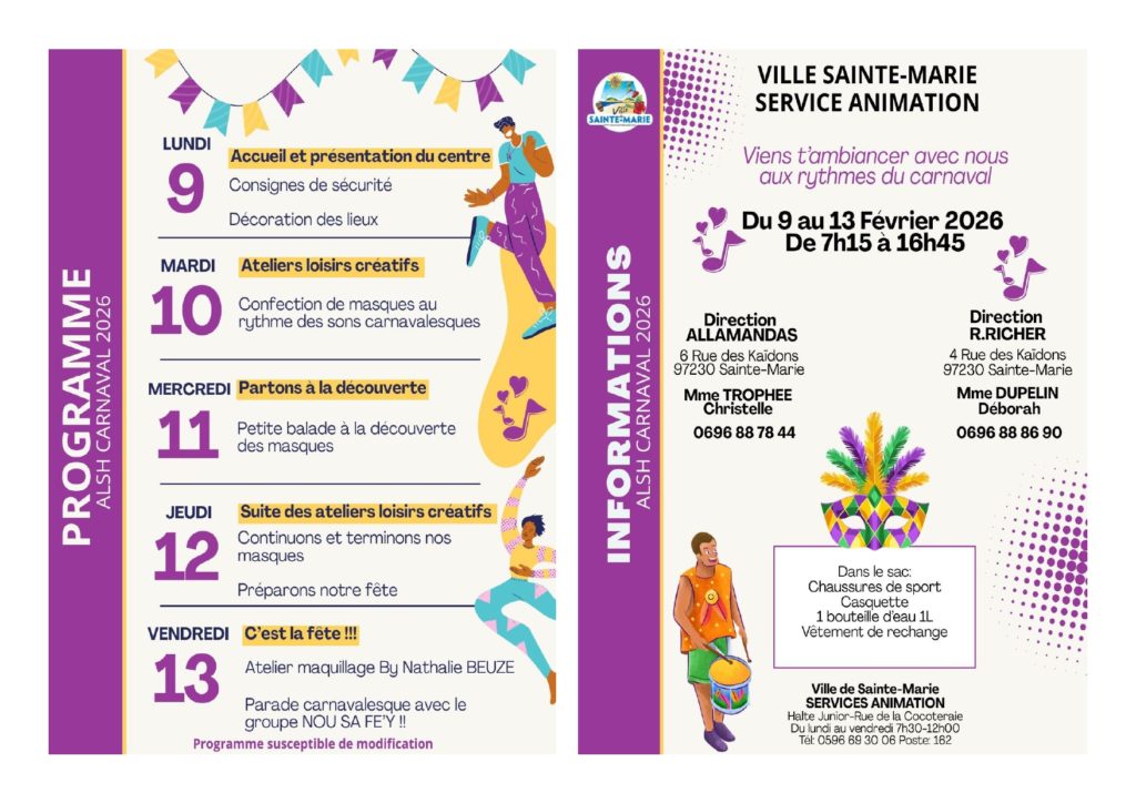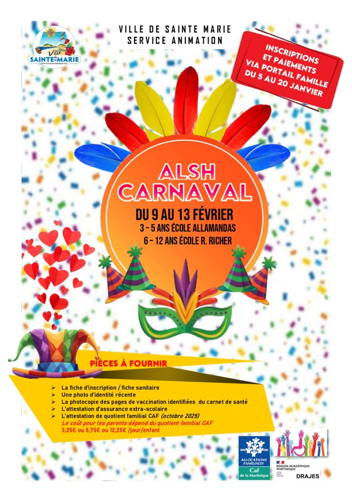 La Ville de Sainte-Marie propose des centres de loisirs spĂ©ciaux Carnaval pour les enfants de 3 Ă 12 ans, du 9 au 13 fĂ©vrier 2026, dans une ambiance festive et colorĂ©e đ