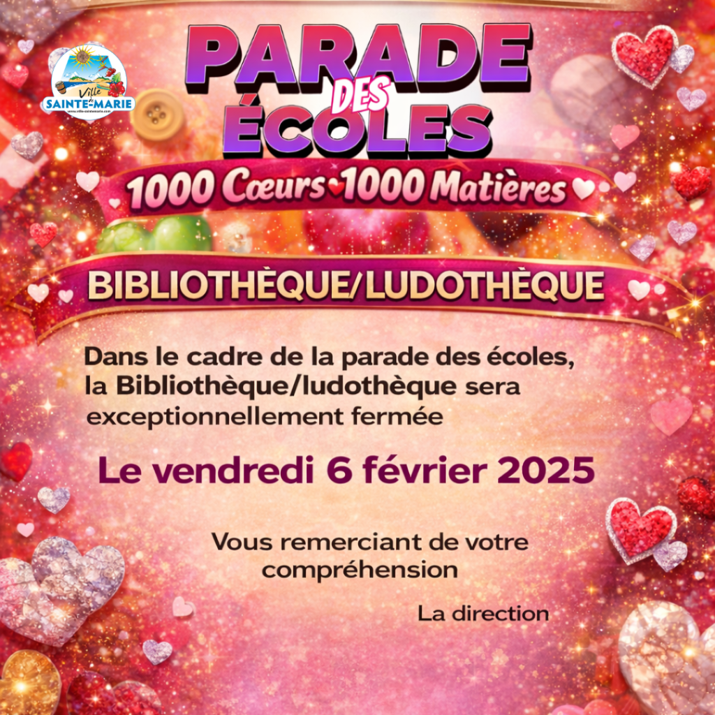Dans le cadre de la parade des écoles, la BibliothÚque/ludothÚque sera exceptionnellement fermée : le vendredi 6 février 2025.