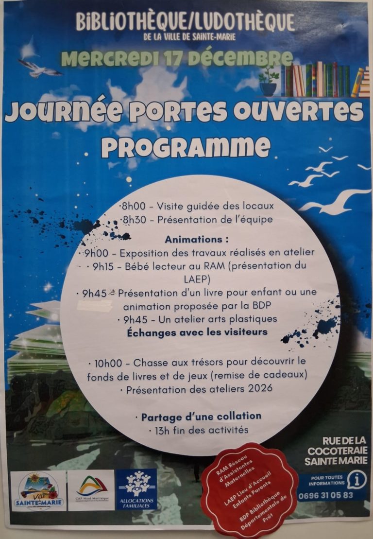 La Bibliothรจque/Ludothรจque de la Ville de Sainte-Marie vous ouvre ses portes pour une journรฉe riche en animations pour toute la famille ! Au programme, dรจs 8h00 : Visites guidรฉes des