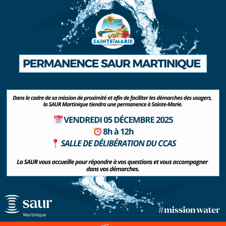 ๐๐ ๐๐๐๐ ๐๐๐๐๐๐๐๐๐๐ ๐๐๐๐ ๐๐๐๐๐๐๐๐๐ ๐๐ ๐๐๐๐ Dans le cadre de sa mission de proximitรฉ et pour faciliter vos dรฉmarches en tant qu’usager, la SAUR Martinique tiendra une permanence ร