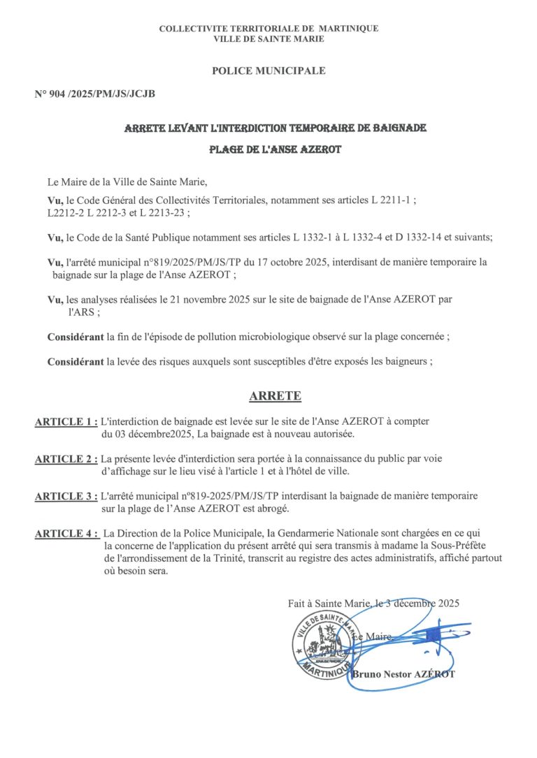 La Ville de Sainte-Marie informe la population que la baignade est de nouveau autorisรฉe ร lโAnse Azerot ร compter du 3 dรฉcembre 2025. Cette dรฉcision fait suite aux analyses rรฉalisรฉes