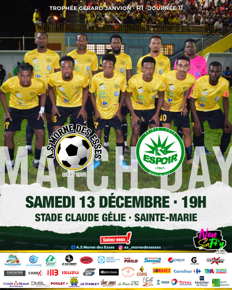 La R1 continue et lโA.S. Morne des Esses vous donne rendez-vous pour la 11e journรฉe du Trophรฉe Gรฉrard Janvion ! โฝ A.S. Morne des Esses vs Espoir Sainte-Luce๐ Samedi 13