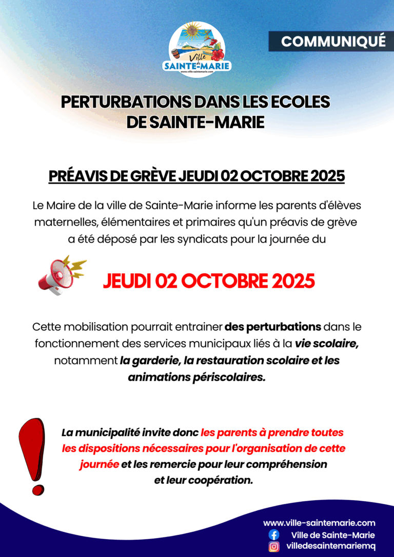 La Ville de Sainte-Marie informe les parents d’élèves qu’un préavis de grève a été déposé pour le jeudi 02 octobre 2025. Cette mobilisation pourrait entraîner des perturbations dans les services