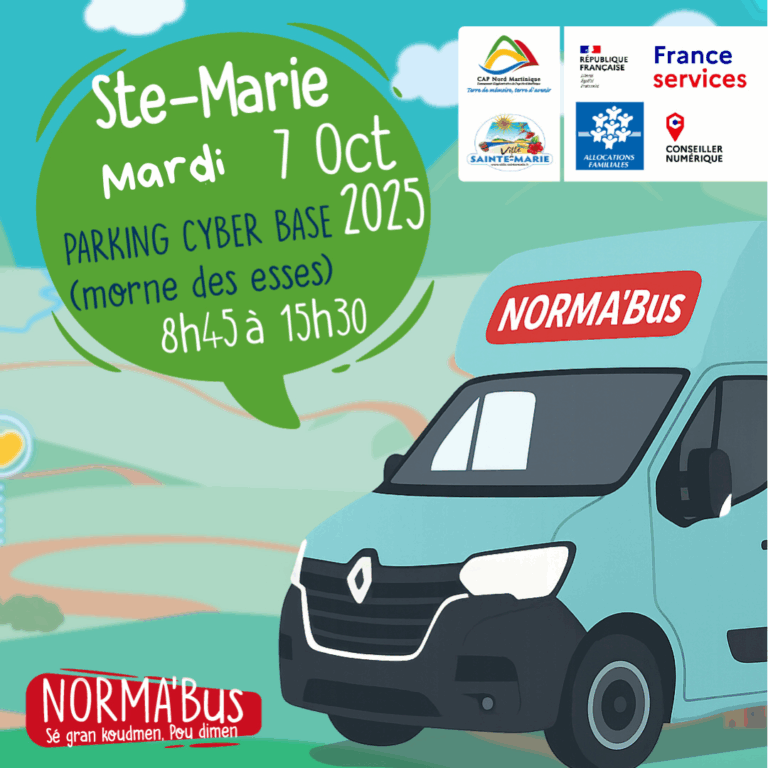 CAP Nord Martinique informe la population de la venue de NORMA’Bus à Sainte-Marie. Mardi 7 octobre 2025 Parking Cyber Base du Morne-des-Esses de 8h45 à 15h30 Ce bus itinérant vous