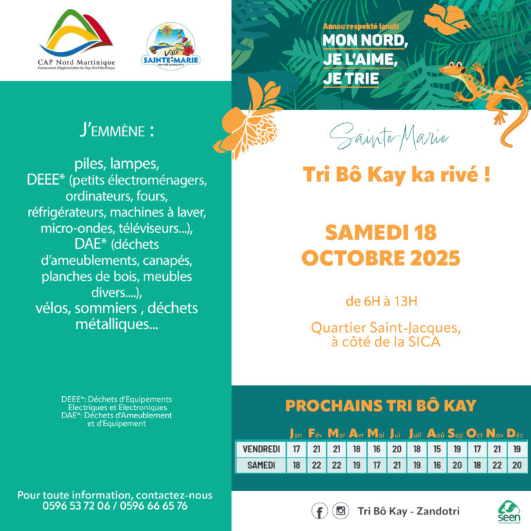 Le tri bô kay, la collecte multi flux de déchets organisée tous les mois dans chacune des communes du Nord par Cap Nord et la SEEN vous propose deux rendez-vous
