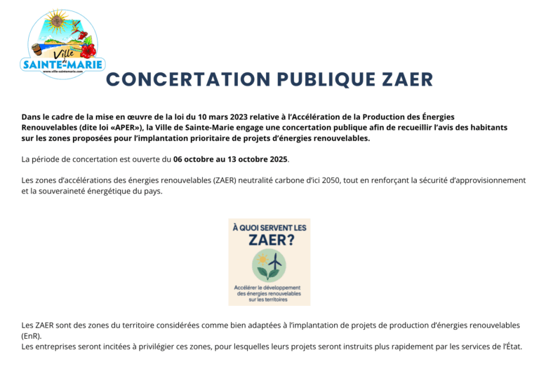 Dans le cadre de la loi du 10 mars 2023 relative à l’Accélération de la Production des Énergies Renouvelables (loi APER), la Ville de Sainte-Marie invite les habitants à donner