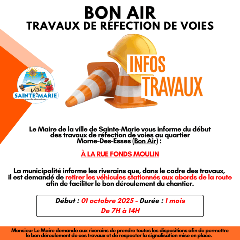 La Ville de Sainte-Marie informe les riverains du démarrage de travaux de réfection de voies au quartier Morne-Des-Esses (Bon Air), rue Fonds Moulin, à compter du : 1er octobre 2025