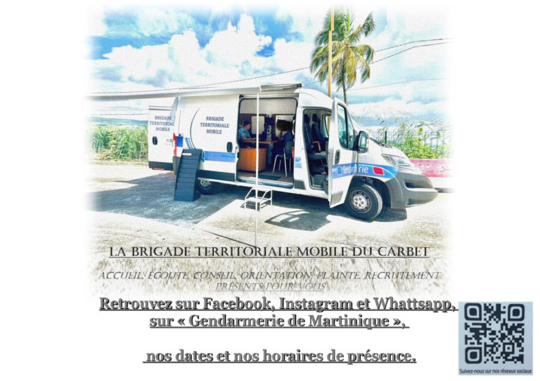 Dans le cadre du service dโaccueil des administrรฉs assurรฉ par la Brigade Territoriale Mobile (BTM) de Le Carbet, nous informons la population que lโunitรฉ sera prรฉsente ร Sainte-Marie le :
