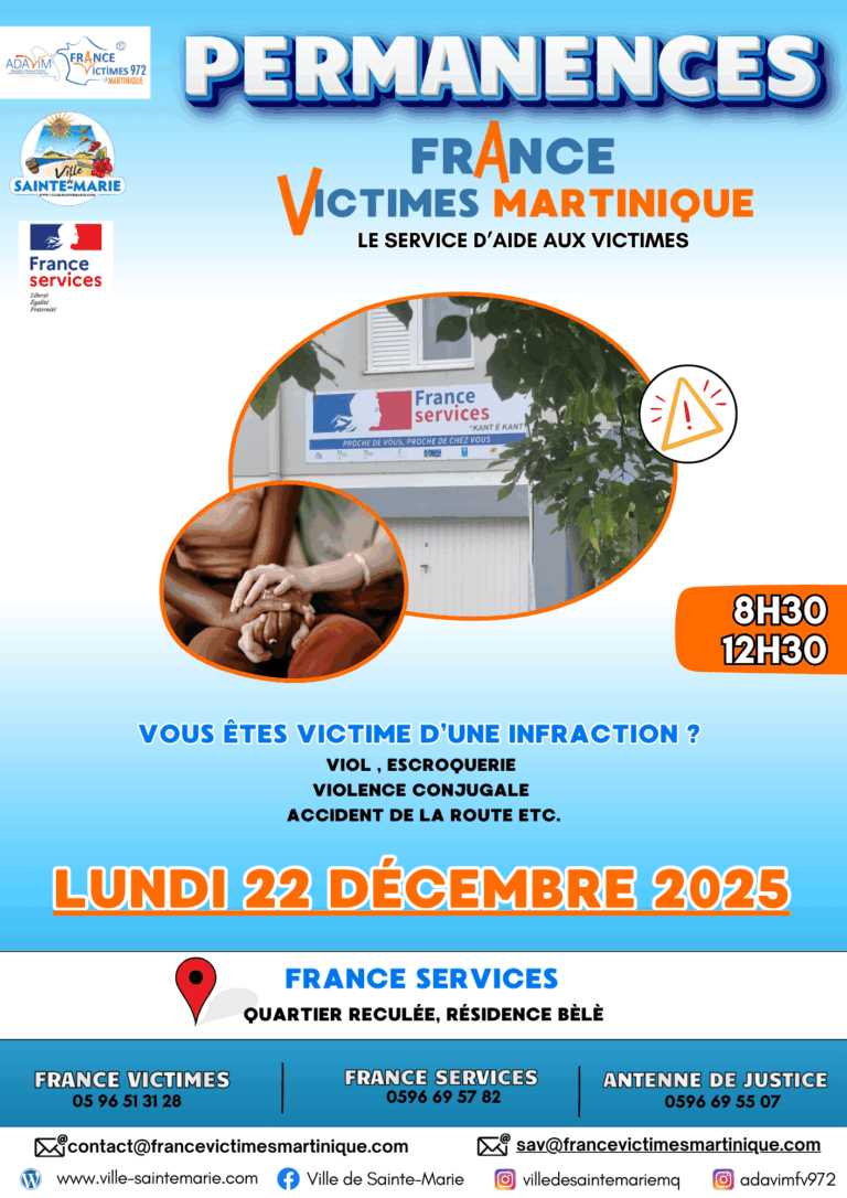 Vous êtes victime d’une infraction (viol, escroquerie, violence conjugale, accident de la route, etc.) ? France Victimes Martinique vous accompagne et vous propose des permanences gratuites à Sainte-Marie. 𝐅𝐫𝐚𝐧𝐜𝐞 𝐒𝐞𝐫𝐯𝐢𝐜𝐞𝐬